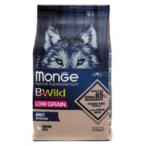 Monge (Монж) Dog BWild LOW GRAIN (холистик) низкозерновой сухой корм из мяса гуся для взрослых собак всех пород. Полнорационный сбалансированный корм из мяса гуся, который разработан с учётом физиологических особенностей взрослых собак всех пород. Идеально подходит в качестве повседневного рациона для домашних питомцев.